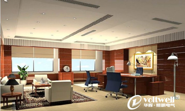 (3)董事長(zhǎng)辦公室,一般進(jìn)行較多的是談話類任務(wù),里面照明需要分區(qū)域進(jìn)行安裝。辦公桌上方要進(jìn)行的書寫閱讀的功能,必要滿足300Lx最低要求。會(huì)客區(qū)域的照明需要柔,照度宜控制在200Lx為佳。裝飾墻,射燈的選取一定要深藏防眩。功率盡量控制在35W或者LED射燈。