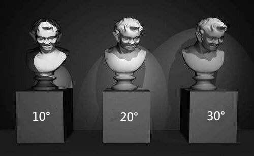 由圖中可見,光束角10°的窄光束聚光燈照射范圍很小,而中心光強(qiáng)最大,在照射面上形成極強(qiáng)的視覺沖擊力。但是,在強(qiáng)烈的明暗對(duì)比下,并不能讓我們看清石膏雕像的細(xì)部,且由于光束角太小,導(dǎo)致雕像并沒有完全展現(xiàn)在我們眼前。