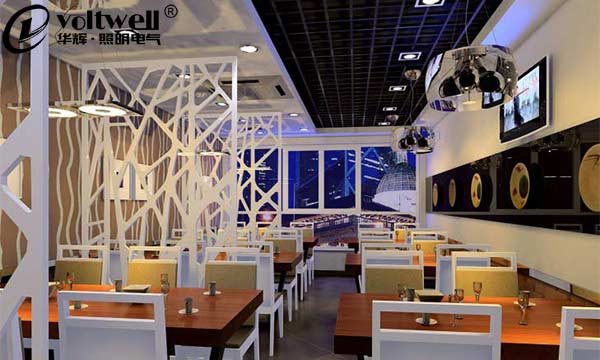 餐飲空間中環(huán)境照明同其他環(huán)鏡燈光一樣,要根據(jù)環(huán)境的特點和氣氛的營造來進行設計,但一般情況下,背景照明、環(huán)境照明和一般照明的照度應低于餐桌上的照度,控制在100lx左右即可,而餐桌上的照度則需要達到200lx-450lx,形成重點區(qū)域照明,與座位四周的局部照明共同創(chuàng)造出親切、私密的氣氛。