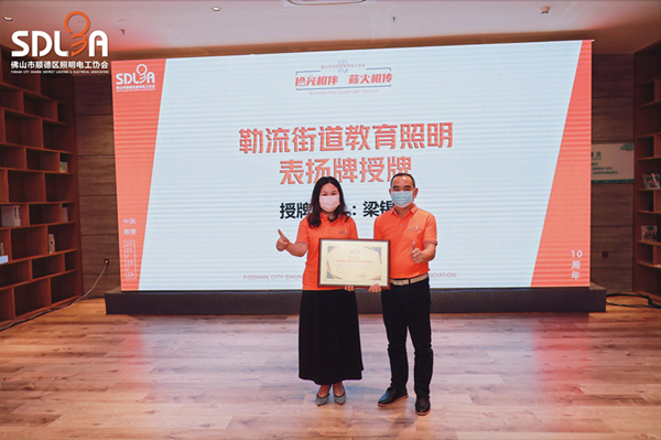 大會(huì)上,對(duì)于華輝教育照明熱心勒流教育事業(yè),樂善好施,順德區(qū)照明電工協(xié)會(huì)會(huì)長(zhǎng)梁錫強(qiáng)先生頒發(fā)感謝狀牌匾,華輝教育照明總經(jīng)理戴姣華女士上臺(tái)領(lǐng)牌匾。
