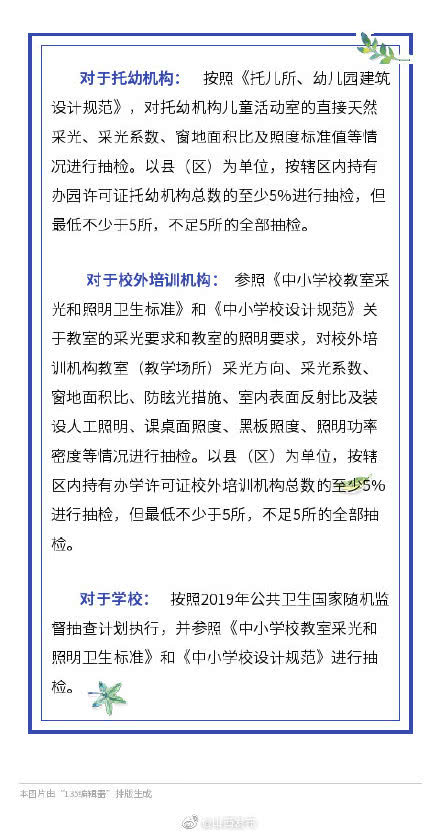 7月6日,從山西省衛(wèi)健委傳來(lái)消息,全國(guó)采光照明雙隨機(jī)抽查工作會(huì)日前在太原市召開,山西將對(duì)學(xué)校、托幼機(jī)構(gòu)、校外培訓(xùn)機(jī)構(gòu)教室(教學(xué)場(chǎng)所)的采光和照明以“雙隨機(jī)”方式進(jìn)行抽檢、記錄并公布。