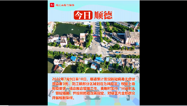 7月9日,廣東佛山順德區(qū)龍江鎮(zhèn)在返佛密接人員排查中發(fā)現(xiàn)1名新冠病毒無癥狀感染者。順德區(qū)迅速開展流調(diào)溯源、區(qū)域管控、核酸檢測(cè)等處置工作,對(duì)密接、次密接等相關(guān)人員落實(shí)管理措施,對(duì)涉及重點(diǎn)場(chǎng)所全面進(jìn)行環(huán)境采樣和終末消毒,在龍江鎮(zhèn)、樂從鎮(zhèn)立即開展區(qū)域核酸篩查,并召集共產(chǎn)黨員志愿者、社區(qū)工作人員及村干部等開展疫情防控工作。