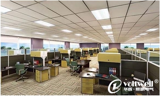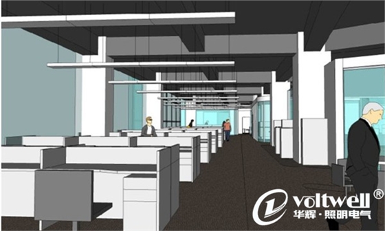 隔開式辦公室多以部門為單位,小區(qū)域集中辦公,方便小組間成員的交流。這類辦公室,如果是玻璃隔斷,一定要注意燈具的安裝,格柵條的方向要與側(cè)面玻璃方向平行一致。注意可避免燈具在玻璃上形成亮斑或者對隔壁空間的影響。燈具多以格柵燈盤為主,滿足基本的辦公任務要求。墻面的漫反射光線也是空間照明均勻度的一個重要因素。