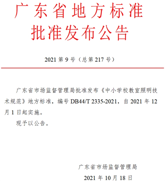 《中小學(xué)校教室照明技術(shù)規(guī)范》該標(biāo)準(zhǔn)于2021年12月1日起正式實(shí)施。發(fā)布會還透露:2023年廣東省將全面完成中小學(xué)校教室照明達(dá)標(biāo)任務(wù)。
