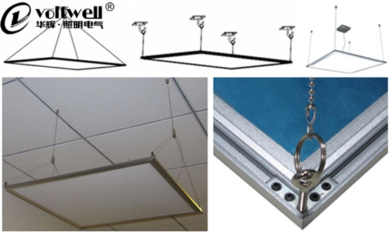 三、鋼絲吊掛式安裝:先天花板上固定好吊線安裝件,鎖上螺絲(吊線出廠時已經安裝好了。)吊線垂直下來,在LED面板燈背面所上懸掛構件。安裝方便省事。消費者一定要注意詢問了解清楚懸掛構件是廠家的標準配件還是選購件。