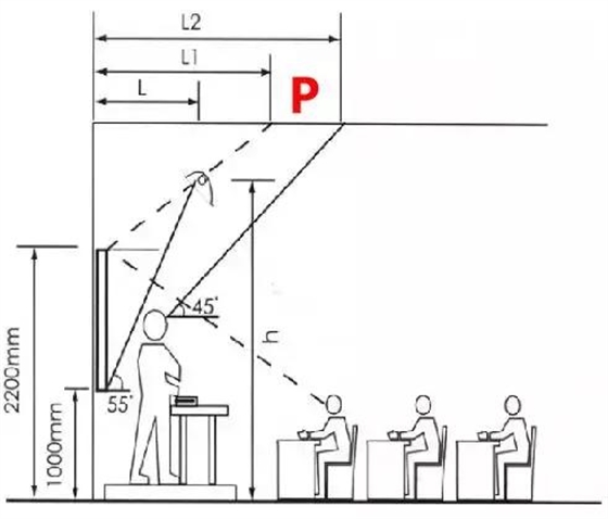 為避免對學(xué)生產(chǎn)生反射眩光,黑板燈具的安裝位置應(yīng)為:第一排學(xué)生看到黑板頂部,并以此視線反射至頂棚求出映像點(diǎn)距離L1,以P點(diǎn)與黑板頂部作虛線連接,燈具應(yīng)該安裝在該連接虛線以上的區(qū)域內(nèi)。