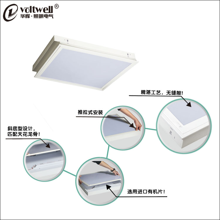 3、多種外形尺寸可供選擇,直接嵌入固定、吊桿安裝,完美匹配常規(guī)龍骨(600x600mm)、公制龍骨(595x595mm)、英制龍骨(605x605mm);明裝燈盤(pán)直接吸頂安裝外形尺寸為:600x600mm